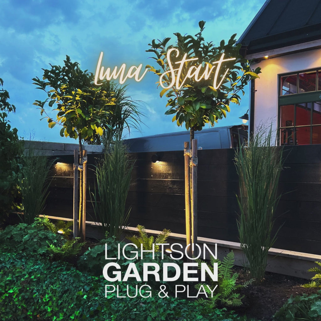 Luna Start is a complete package designed to make it easy to get started with garden lighting. It includes two dark grey Luna ground spotlights, a splitter cable, and a transformer with enough capacity to expand your system with additional lights.